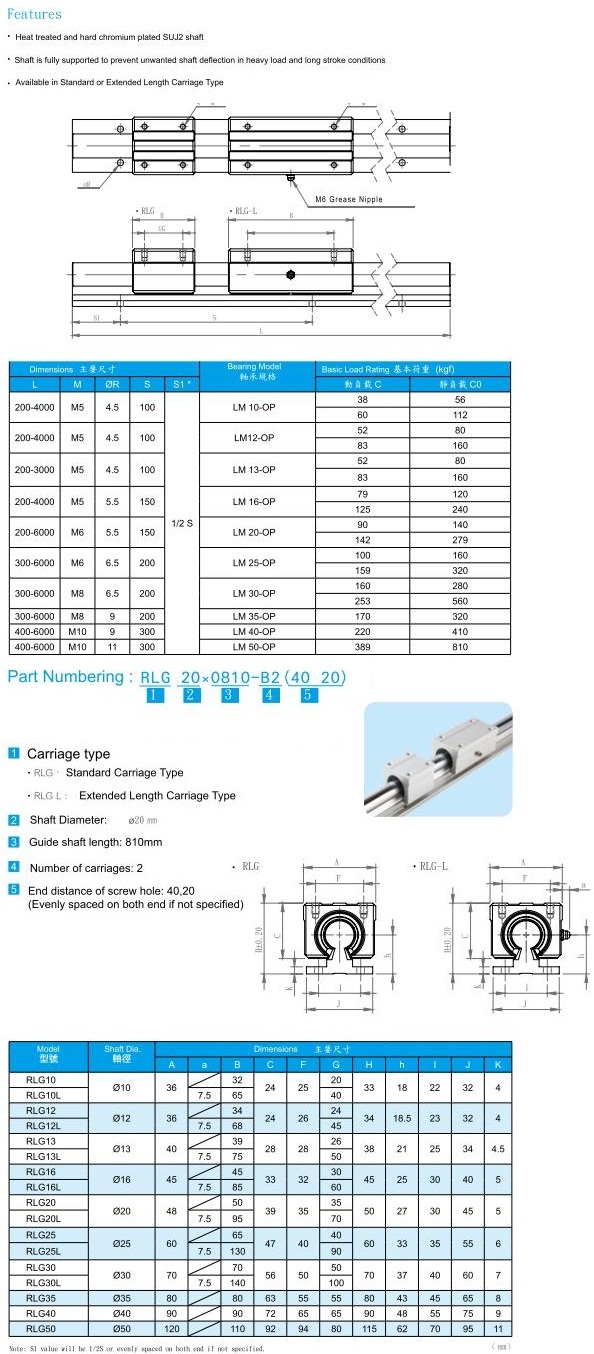Thông số kỹ thuật dòng trục trượt tròn RLG series: