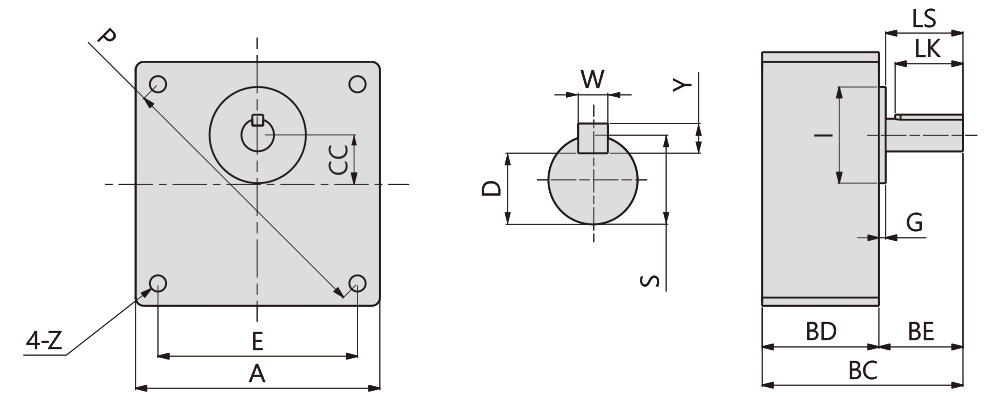| MODEL | OUTPUT (W) | RATIO | A | BC | BD | BE | CC | I | G | P | Z | E | OUTPUT SHAFT | WEIGHT | |||||