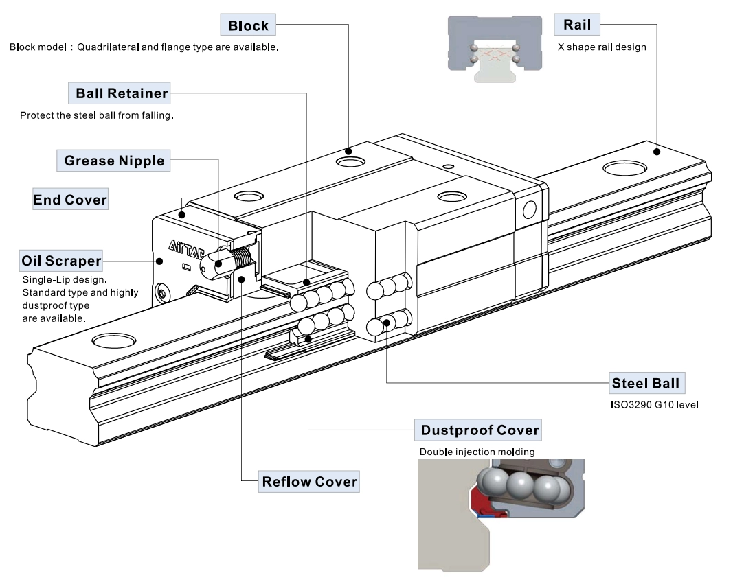 Góc tiếp xúc 45 độ của bốn hàng bi thép với rãnh trượt giúp các viên bi đạt được tiếp xúc hai điểm lý tưởng, có khả năng chịu được lực tác động và phản lực theo cả phương hướng tâm và phương ngang. Đồng thời, có thể áp dụng tải trước để tăng thêm độ cứng khi cần thiết. Thiết kế này giúp giảm chiều cao tổng thể của con trượt và ray trượt, rút ngắn chiều dài con trượt, đáp ứng yêu cầu thu nhỏ kích thước.